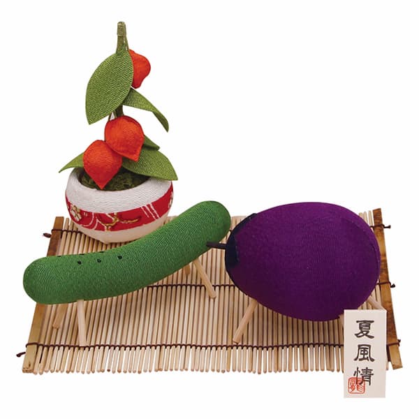 きゅうりやナスの飾り物をさりげなく。シンプルにそれだけ飾っても、お盆らしさが出てオススメです。近年は、ちりめん素材やクリスタル素材など様々なタイプが発売されており、可愛らしいインテリア小物としても人気です。